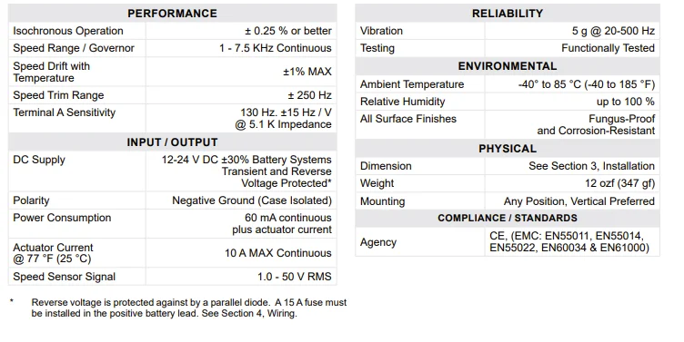 The ESD2200 Series speed control unit is an all-electronic device designed to control engine speed with fast and precise response to transient load changes. This closed loop control, when connected to a proportional electric actuator and supplied with a magnetic speed sensor signal, will control a wide variety of engines in an isochronous or droop mode. It is designed for high reliability and it's hard potted to withstand the engine environment.